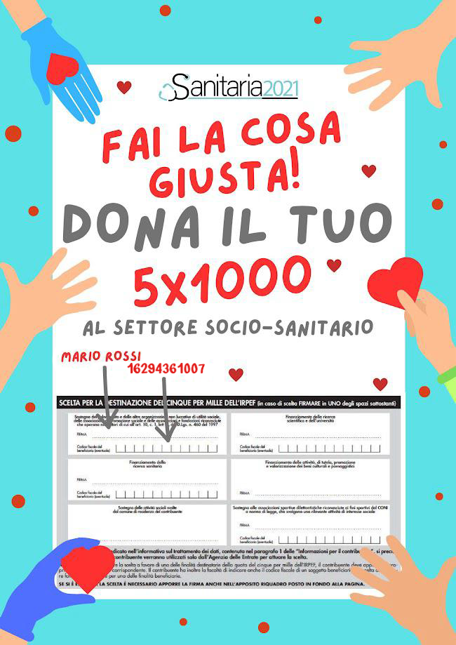 Innanzitutto, è bene specificare che qualsiasi ente, associazione o organizzazione che riceve il 5×1000 ha l’obbligo di dichiarare e documentare le somme ottenute e il loro utilizzo. Sanitaria 2021 si prende cura delle persone promuovendo IL MODO GIUSTO DI FARE ASSISTENZA. Utilizzeremo il tuo 5×1000 per continuare a creare nuove opportunità lavorative nel settore socio-assistenziale e promuovere ed attuare politiche sociali di sostegno. Per te un piccolo e veloce gesto che non ha alcun costo, per noi un grandissimo aiuto per il nostro lavoro.